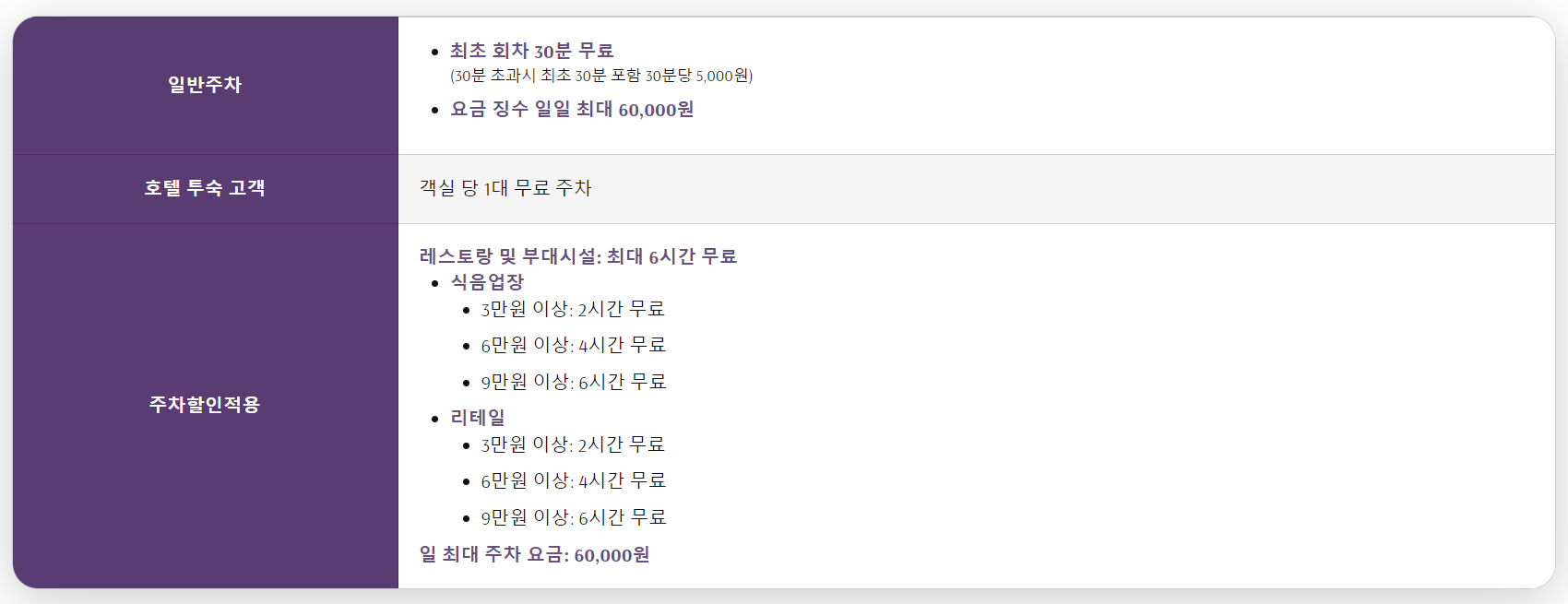 | 일반주차 | 최초 회차 30분 무료 | (30분 초과 시 최초 30분 포함 30분당 5,000원) |