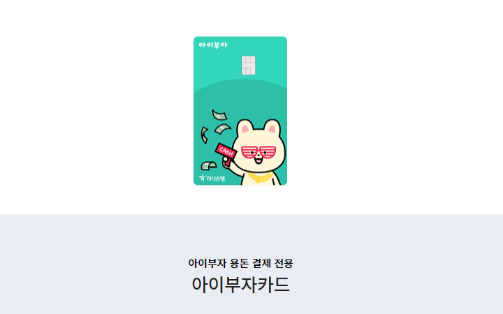 하나은행에서 출시한 아이부자 카드는 4대 시중은행 중 유일하게 용돈카드를 제공합니다. 자녀가 미션을 수행하면 용돈을 받을 수 있는 기능이 있으며, 부모와 자녀가 '남은 용돈' 또는 '남은 용돈 + 거래 내역'을 함께 볼 수 있는 선택 기능이 있습니다.